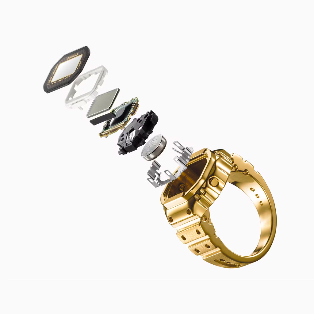 Un reloj de pulsera digital para el dedo: práctico y divertido. Diseño compacto, aspecto sofisticado y un toque de pura diversión. Crear una versión de tamaño anillo de la compleja forma y funciones del reloj Casio no fue tarea fácil. Para que esto fuera posible, necesitábamos utilizar el avanzado moldeo por inyección de metal (MIM) para recrear con precisión los detalles más finos en acero inoxidable. El anillo se termina con un baño de iones de color dorado que le da un brillo resplandeciente.