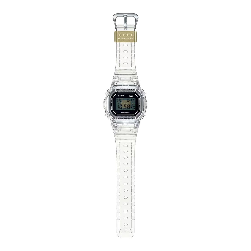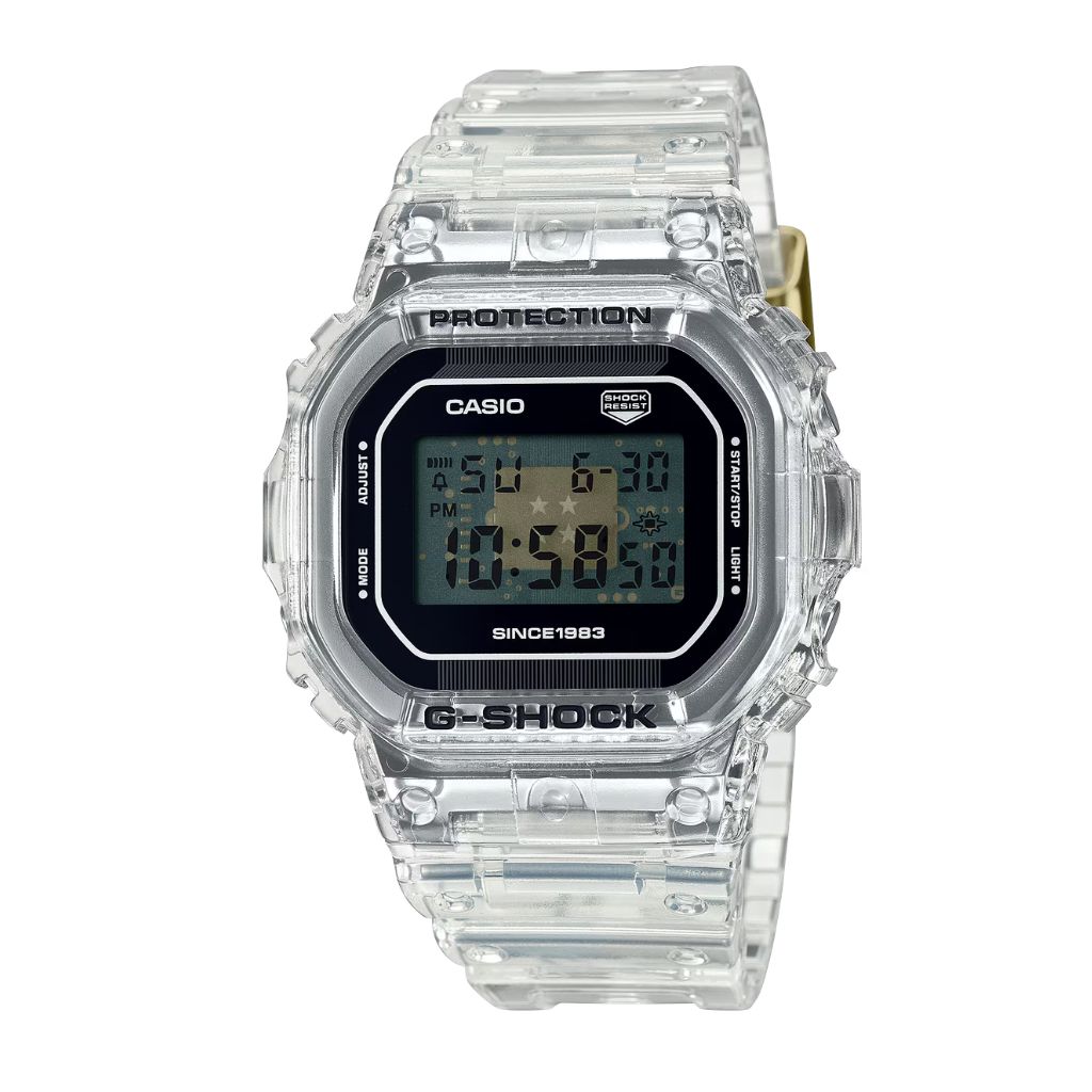 Exprésate con los nuevos modelos Clear Remix del 40.º aniversario de G-SHOCK: populares diseños construidos con componentes transparentes para lograr un look más que claro. Los materiales transparentes de la correa, la carcasa, la esfera, la pantalla LCD y los botones, proporcionan una vista al interior del módulo, donde encontramos la marca G y el logotipo G-SHOCK impresos. En la parte posterior de la carcasa luce el logotipo del 40.º aniversario, diseñado por Eric Haze, y la hebilla de la correa está grabada con cuatro estrellas, haciendo un guiño a este aniversario tan especial. Estos detalles y el uso por primera vez de una carcasa transparente, fabricada con diamida de fibra de vidrio translúcido, ofrecen un diseño singular, digno de un G-SHOCK de edición limitada.