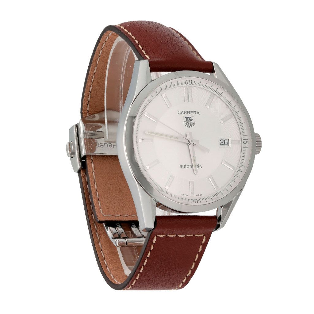 Reloj TAG Heuer automático suizo con diseño clásico y elegante. Caja de acero inoxidable de 39 mm, esfera plata con ventana de fecha, cristal de zafiro. Equipado con el confiable movimiento Calibre 5 y fondo de caja transparente. Ideal para uso diario o formal.
